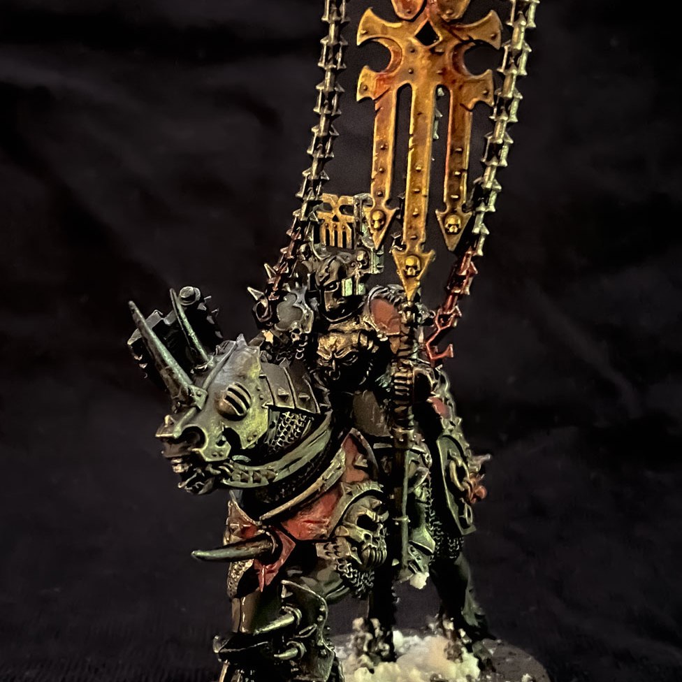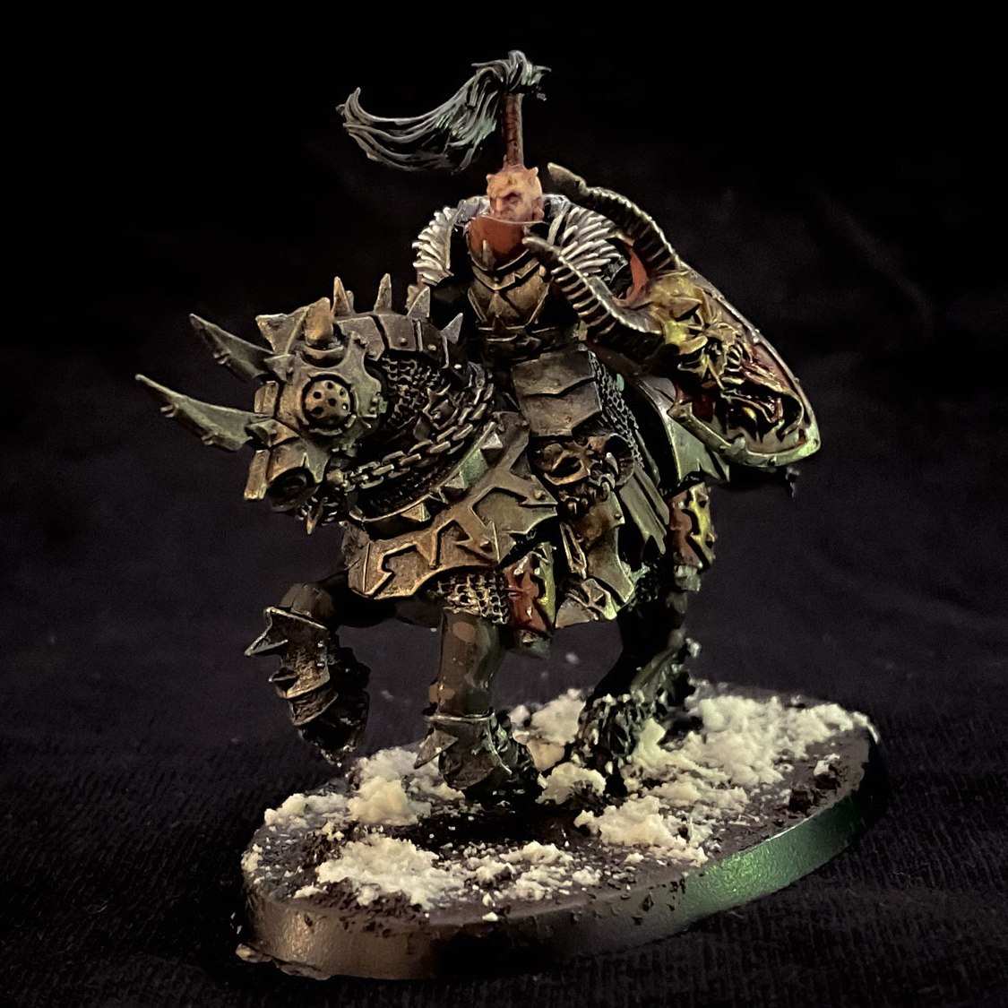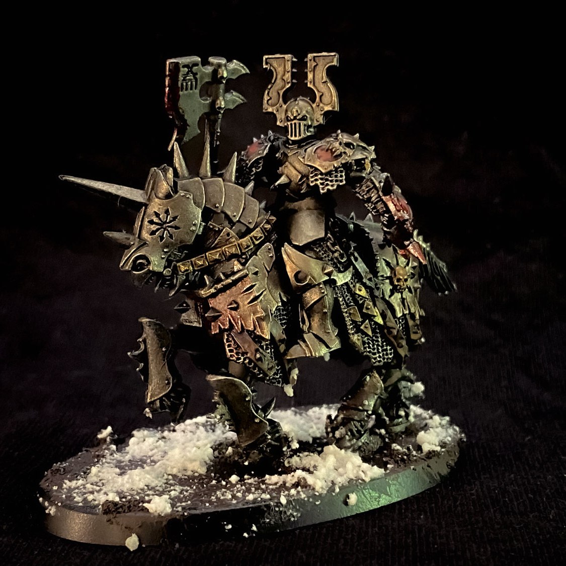 The story behind this unit is that they were originally Knights of the White Wolf and followers of Ulric. I’ll tell the story of their fall to chaos in a lore post someday soon. But to represent their former allegiance, I’ve inserted some wolf iconography here and there. The unit champion is even wearing a white wolf pelt.