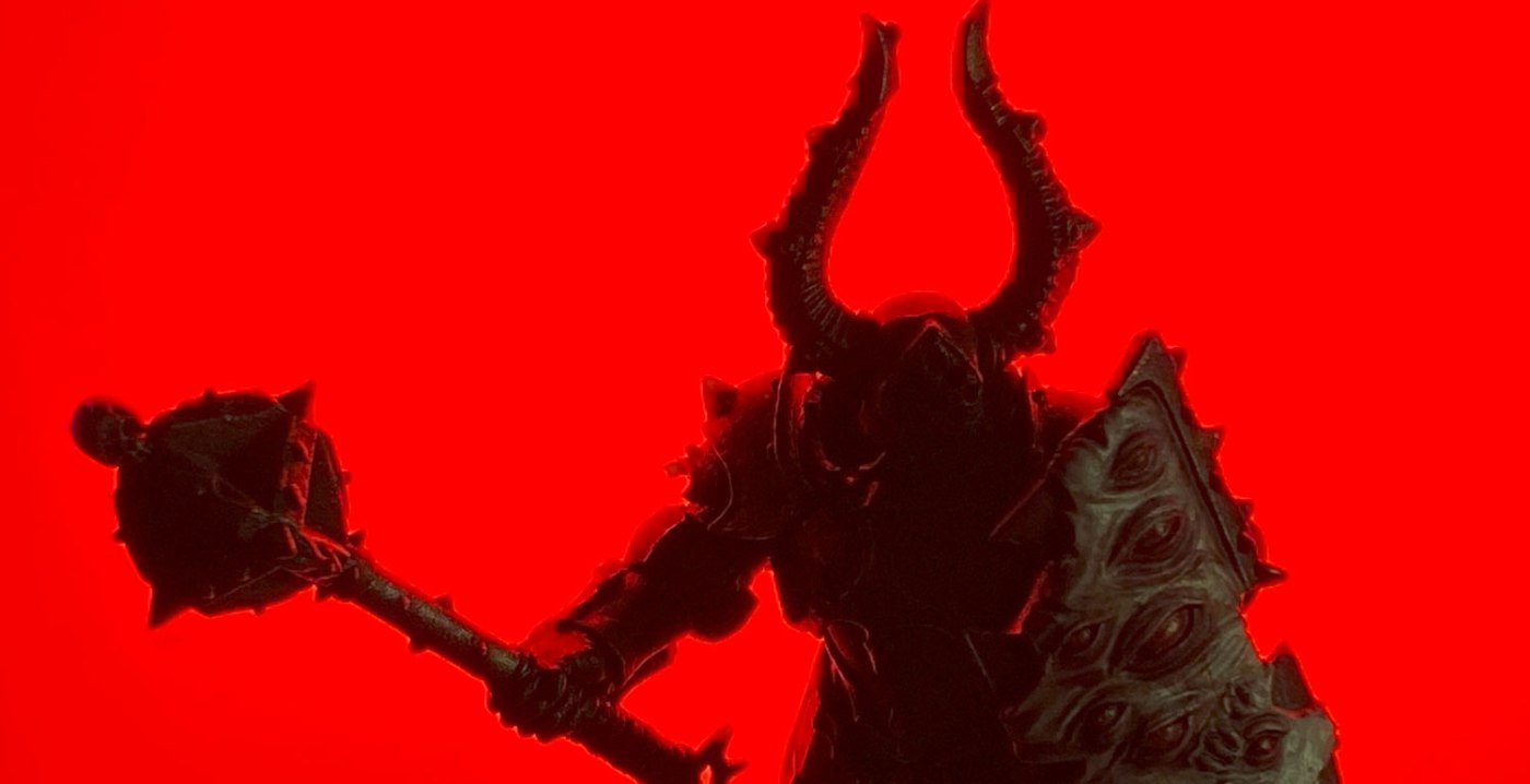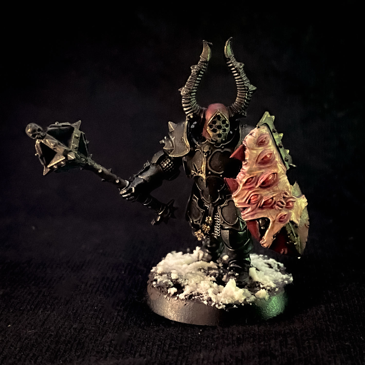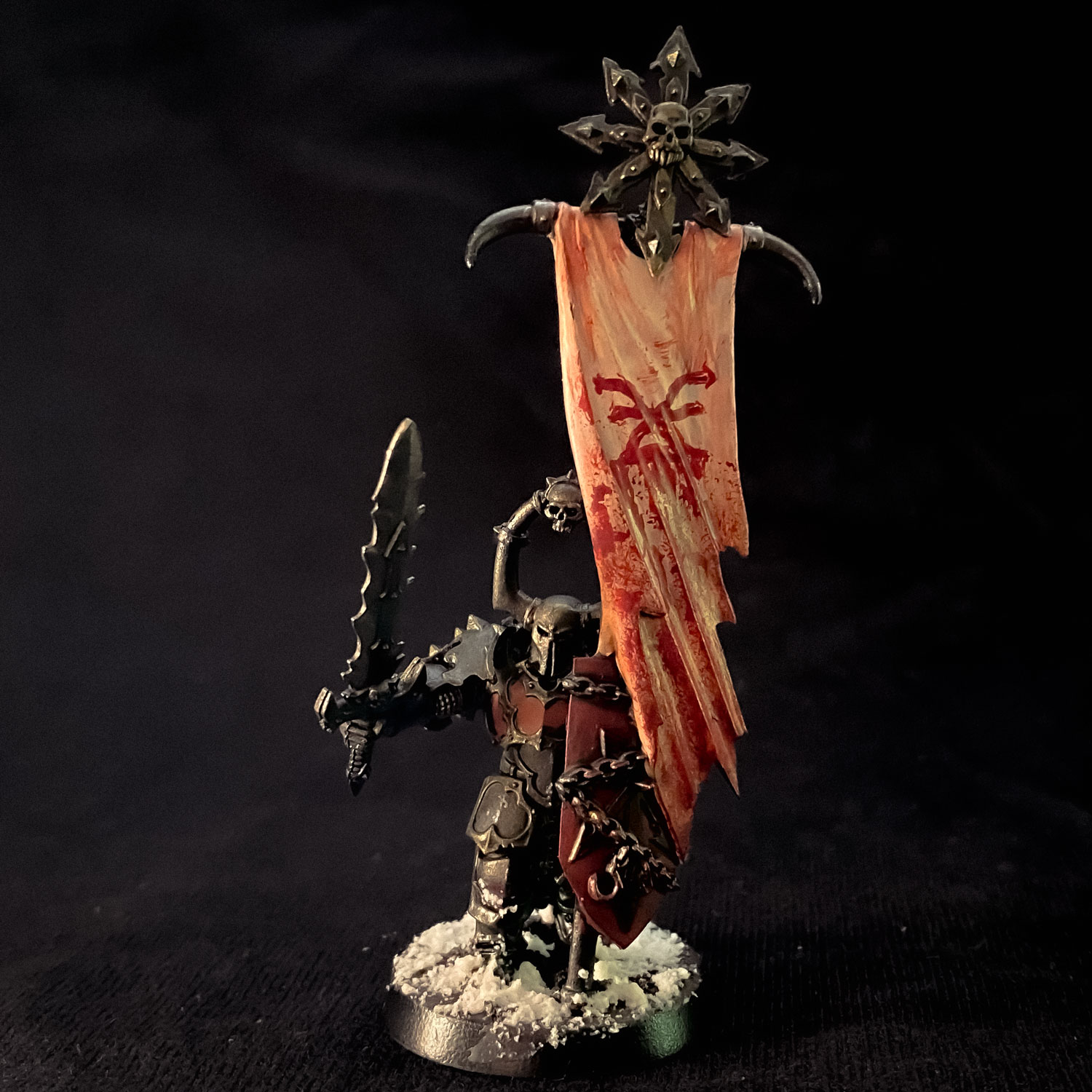 My favorite model is the one with the shield covered in eyes. A lot of times, Khorne followers are depicted as nothing more than blood-soaked barbarians. Which is very appropriate. But the lack of sorcery among Khorne’s legions makes it easy to forget that these are followers of an entirely alien, uncanny, and existentially horrifying intelligence. They should have terrifying and unexpected mutations just like the followers of all the other gods! I’ll try to focus more on the weird and unsettling aspects of chaos in my future Khorne units.
