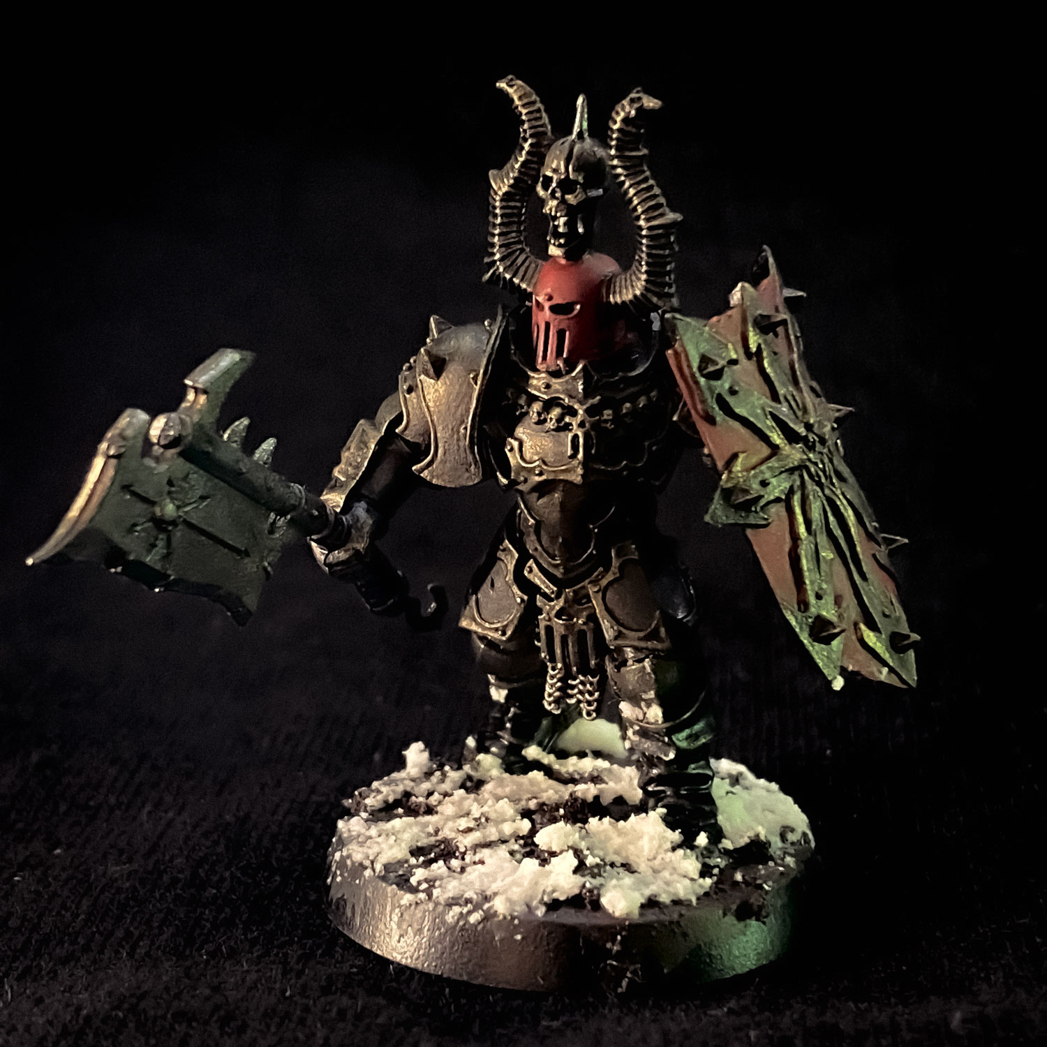 This unit represents a lot of firsts for me. It was my first time attempting a flaming lava weapon scheme. And it’s actually the first unit I created for the entire army. I saw a tutorial video on the official Warhammer channel showing how to kitbash Khorne-marked warriors using a box of Blood Warriors and Chaos Knights. The left over bits allowed me to build my unit of Khorne Knights as well. After that I was completely hooked on kitbashing Slaves to Darkness. I started converting a unit of Warriors and a unit of Knights for each of the 5 marks of Chaos. As I finished the last unit, I knew I needed to expand the scope to a whole army of heavily converted, heavy metal barbarians. So now I’m working on all the various Lords on foot, Lords on mount, and Lords sorcerer. Basically whatever units interest me from the army book, I’m converting 5 of them!