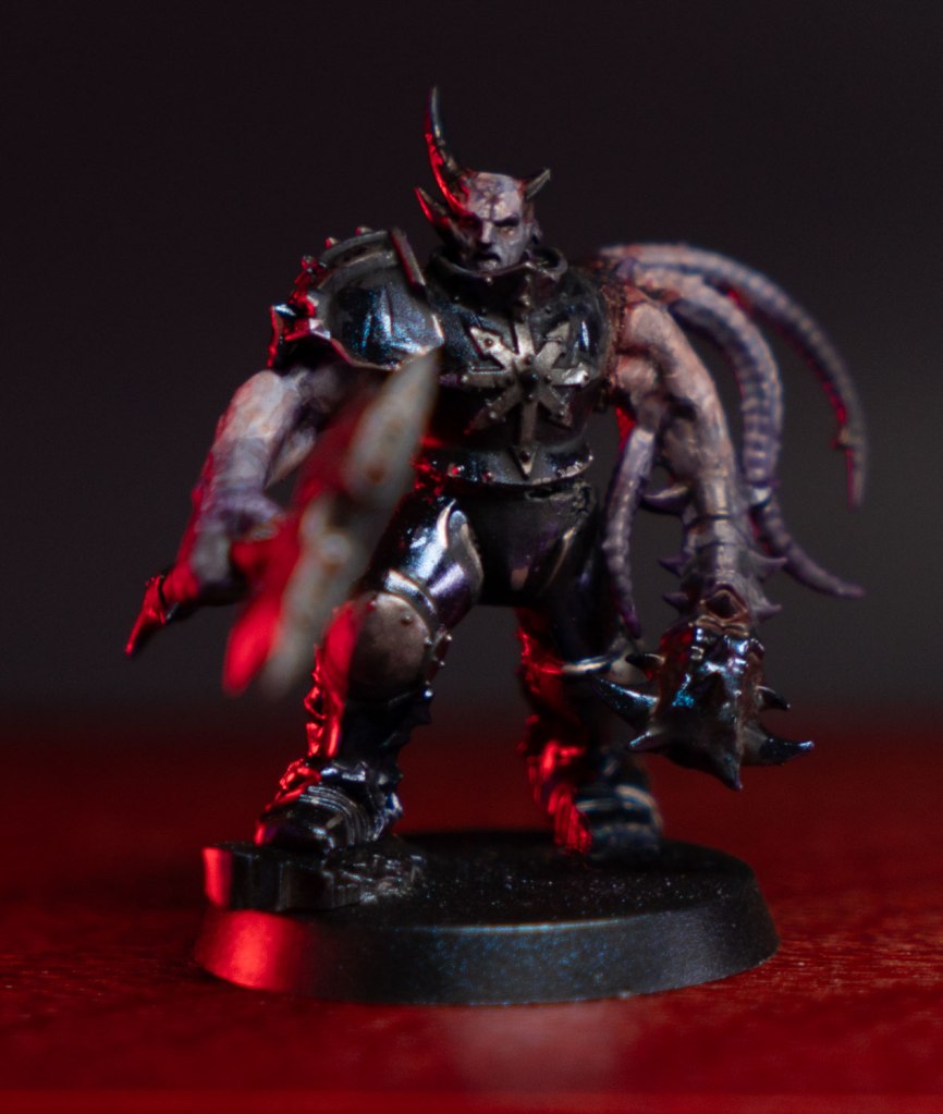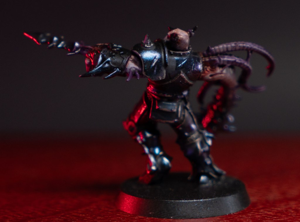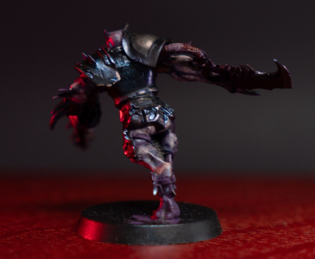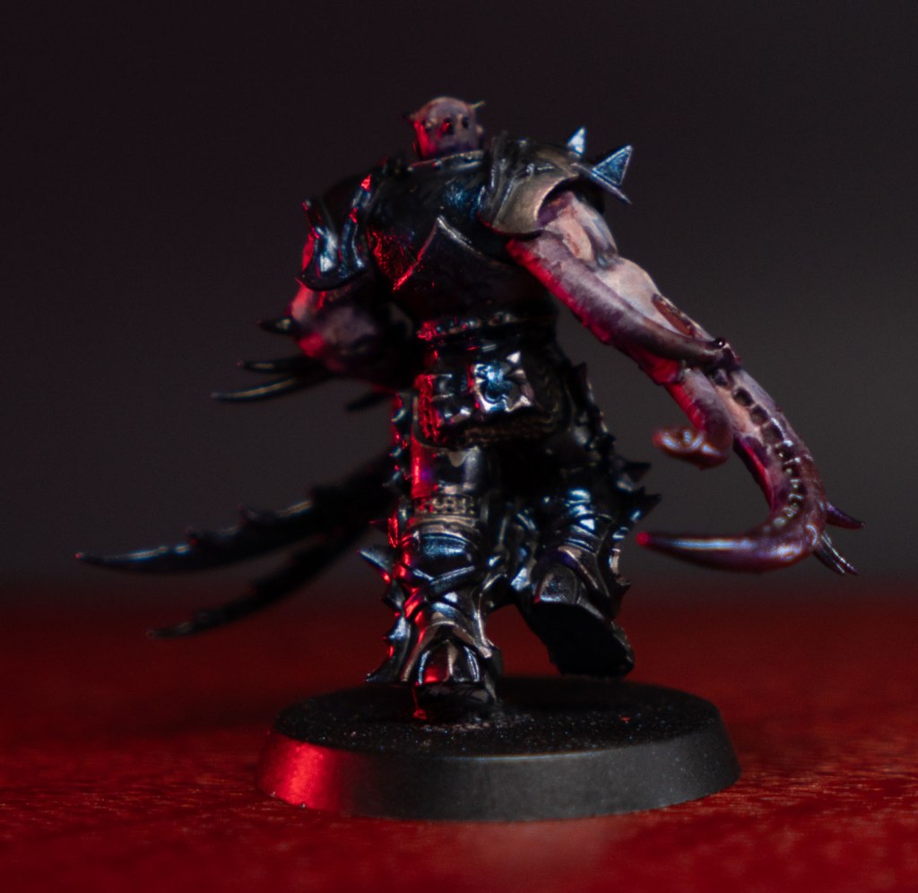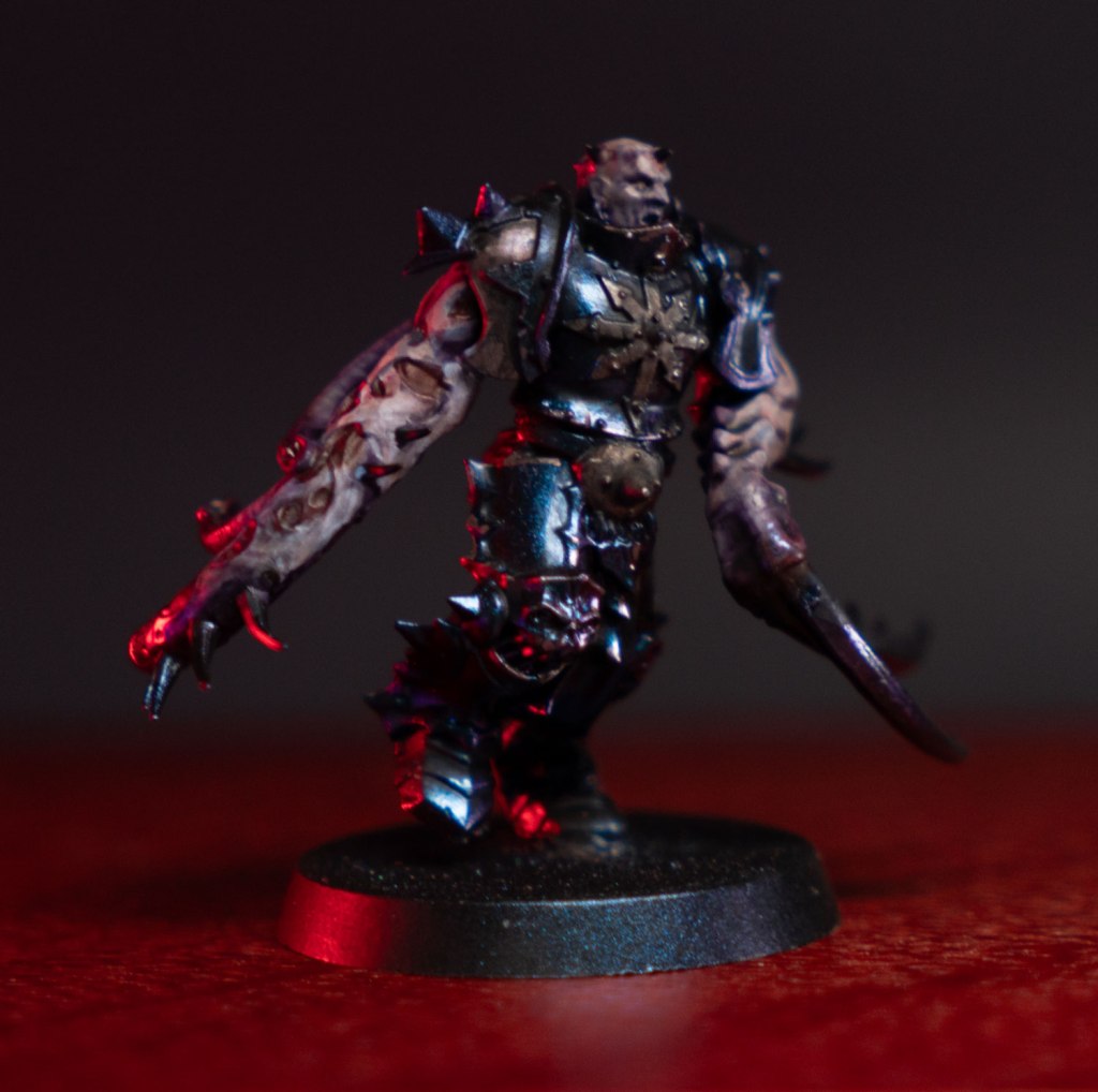 For this kitbash the legs come from Khorne Skullreapers, the torsos come from Khorne Skullcrushers, the arms are were taken from Chaos Space Marine Possessed, and the heads come from the new Chaos Chosen kit. The armor is a blue to purple colorshift paint which doesn’t show up very well on camera. But it’s brilliant in person. These aren’t necessarily tzeentch-marked, but I used them as an opportunity to practice the color scheme for my unit of Tzeentch Warriors which will be painted up soon!