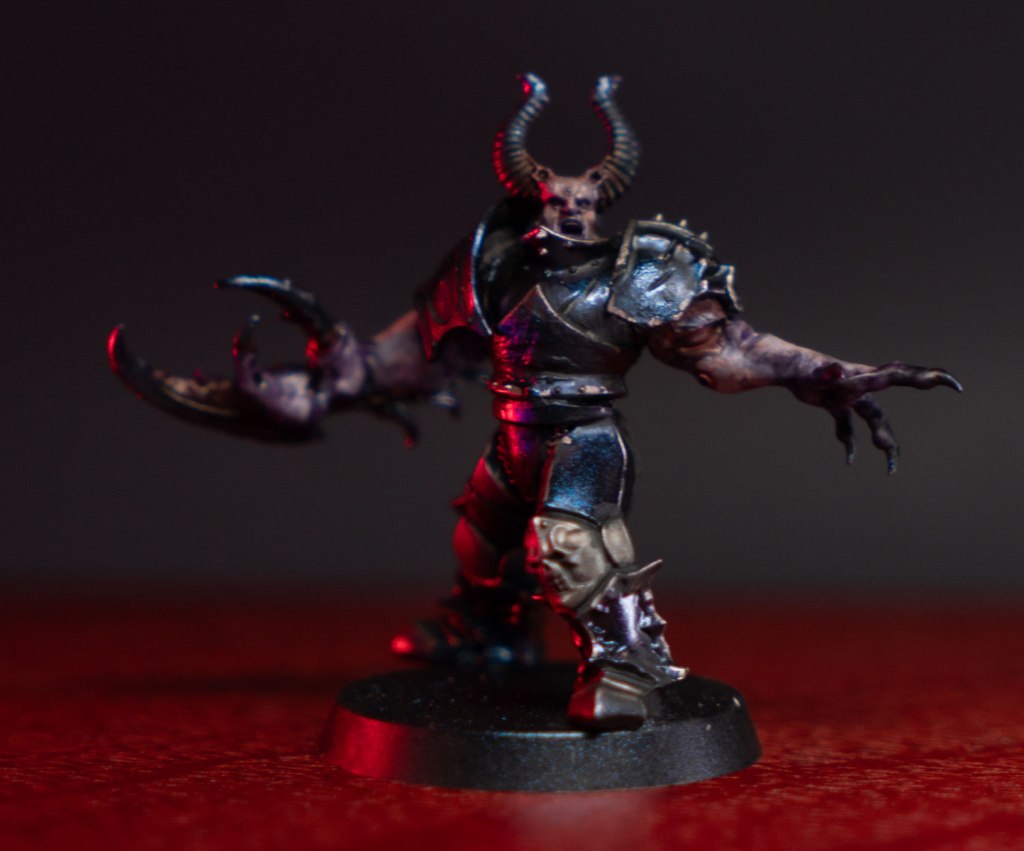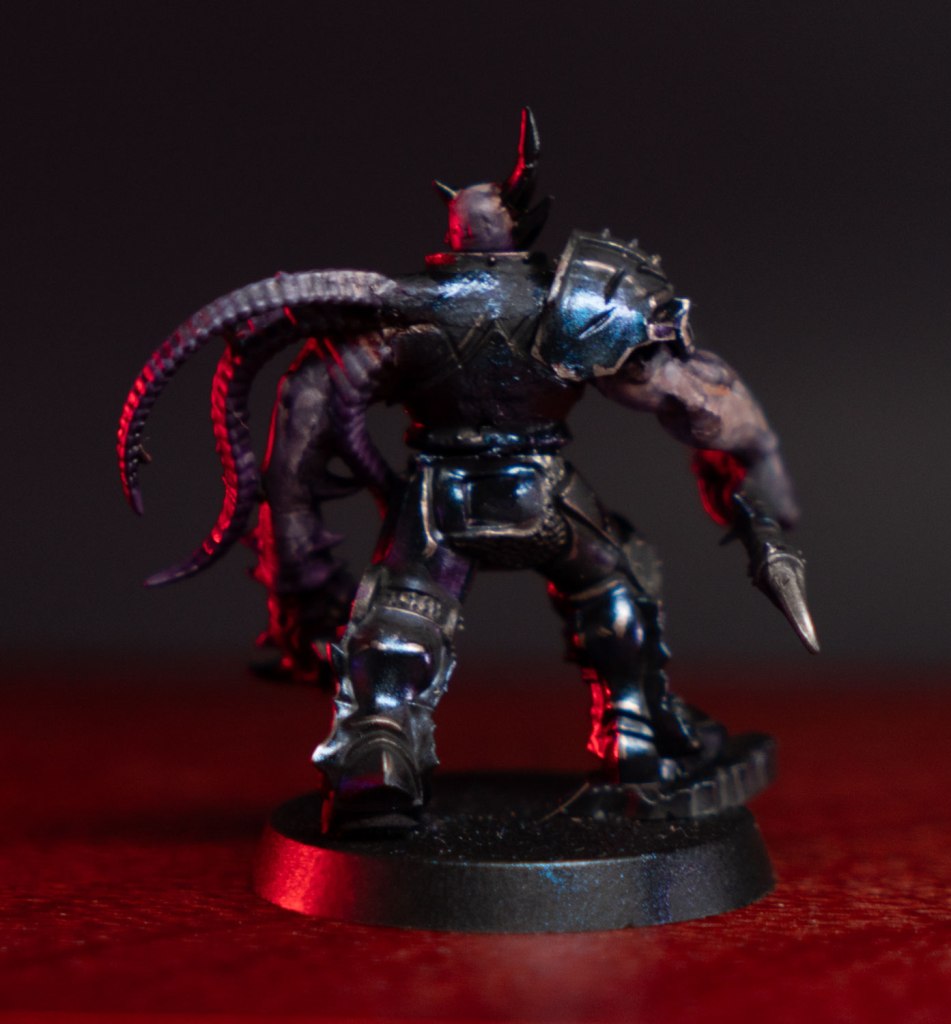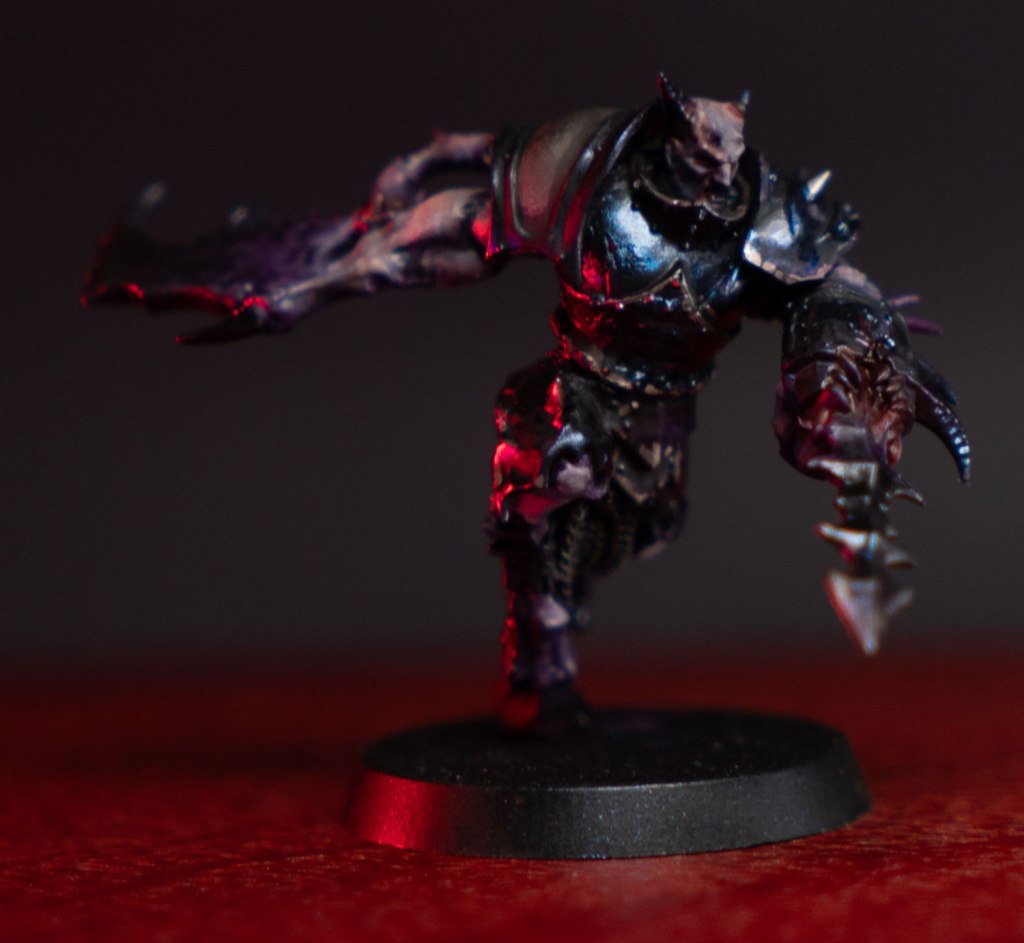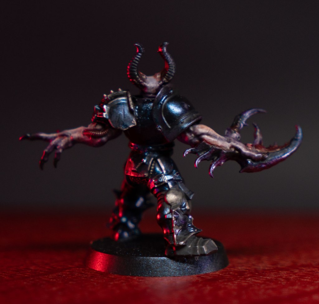For this kitbash the legs come from Khorne Skullreapers, the torsos come from Khorne Skullcrushers, the arms are were taken from Chaos Space Marine Possessed, and the heads come from the new Chaos Chosen kit. The armor is a blue to purple colorshift paint which doesn’t show up very well on camera. But it’s brilliant in person. These aren’t necessarily tzeentch-marked, but I used them as an opportunity to practice the color scheme for my unit of Tzeentch Warriors which will be painted up soon!