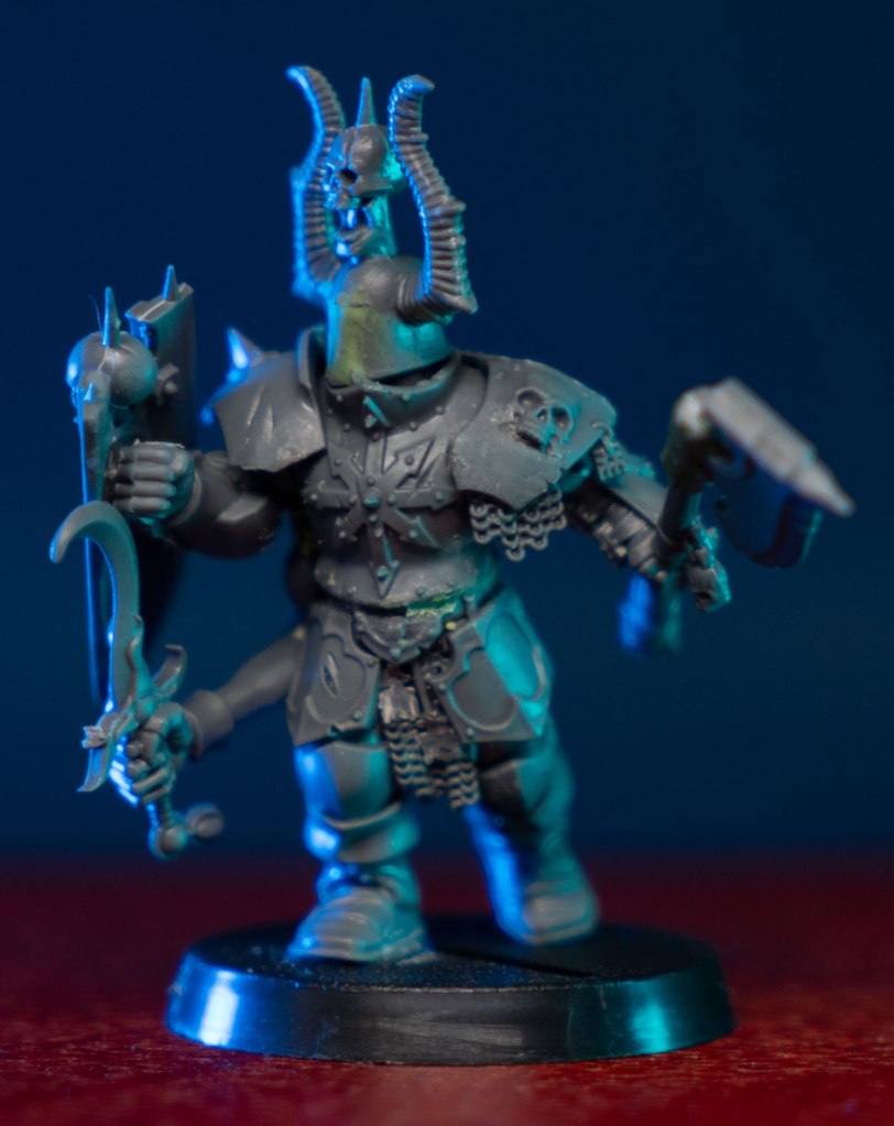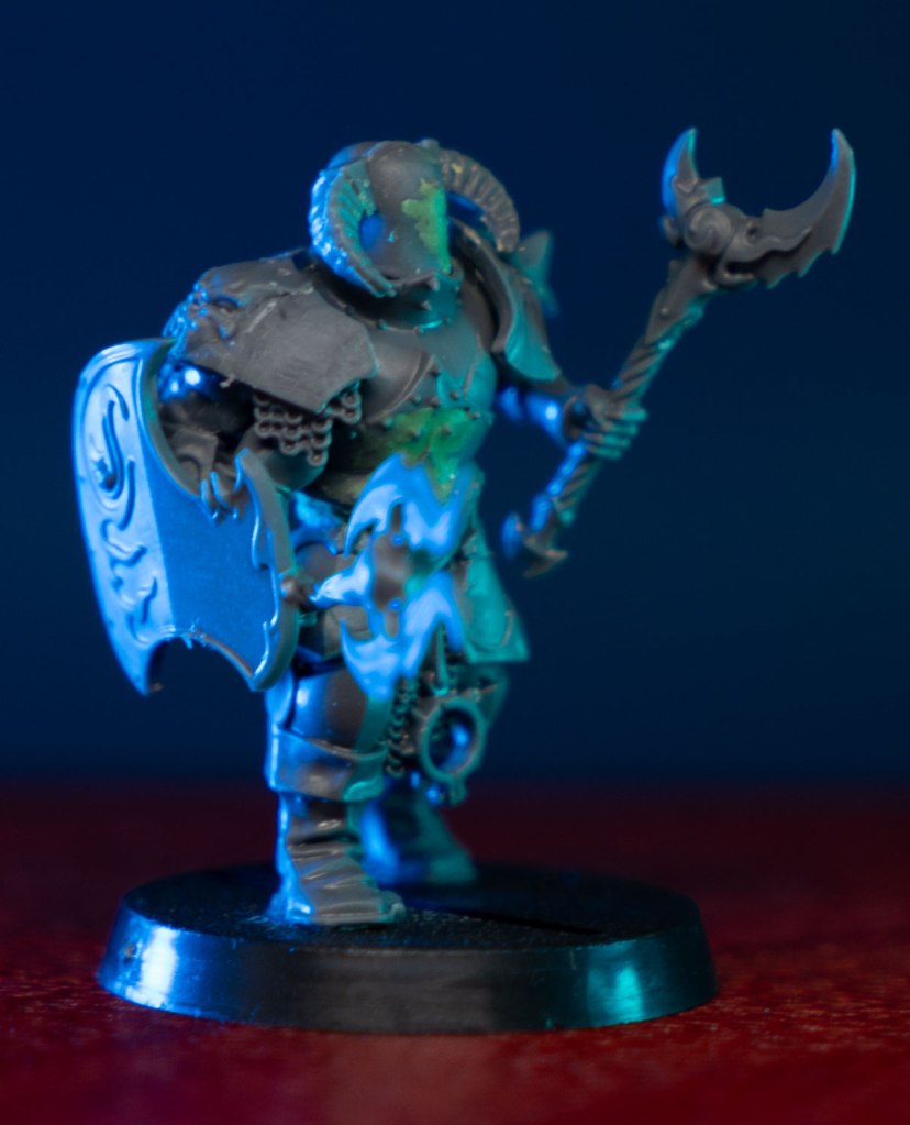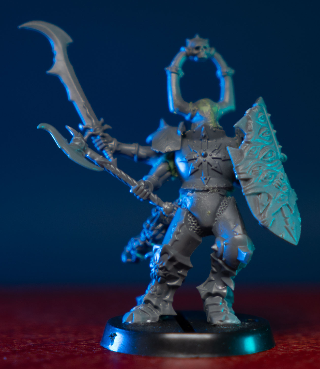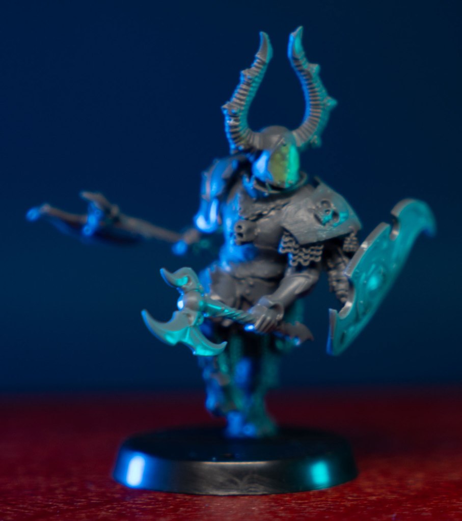 I had a few design rules in mind when converting all of my Tzeentch units. They need to have smooth rounded armor (to show off the color shift paint), their helmets needed to have the eyeholes filled in for a spooky blinded look, and they need multiple arms. Preferably an odd number. Since they’re all blind, I gave the unit champion a shield covered in eyes. I imagine he’s the only one that can see. The rest see only the shifting currents of the winds of magic, and faint ghostly outlines of the souls of their enemies on the battlefield.