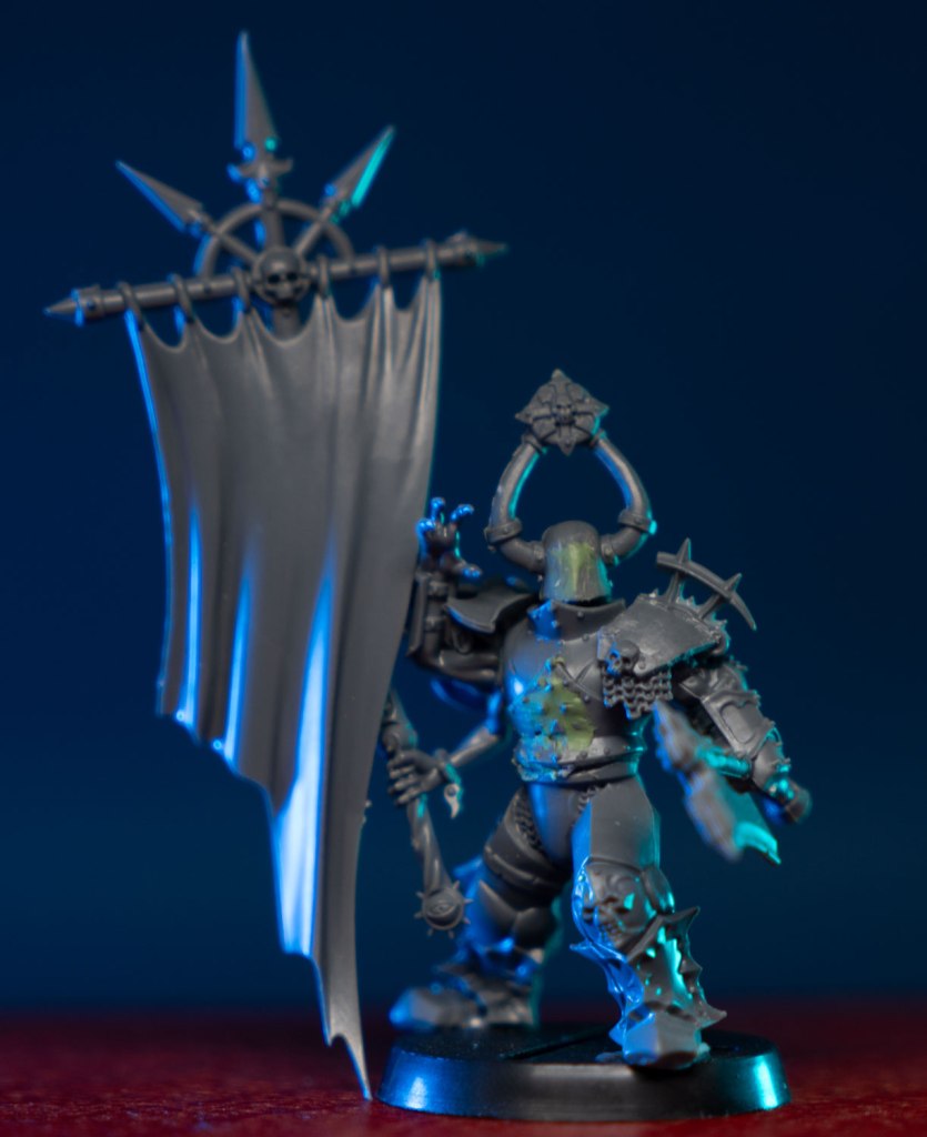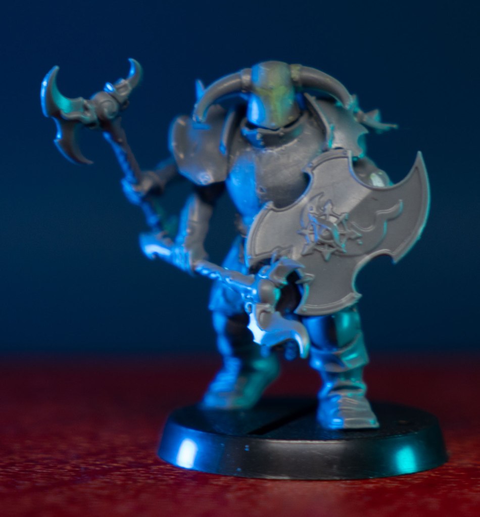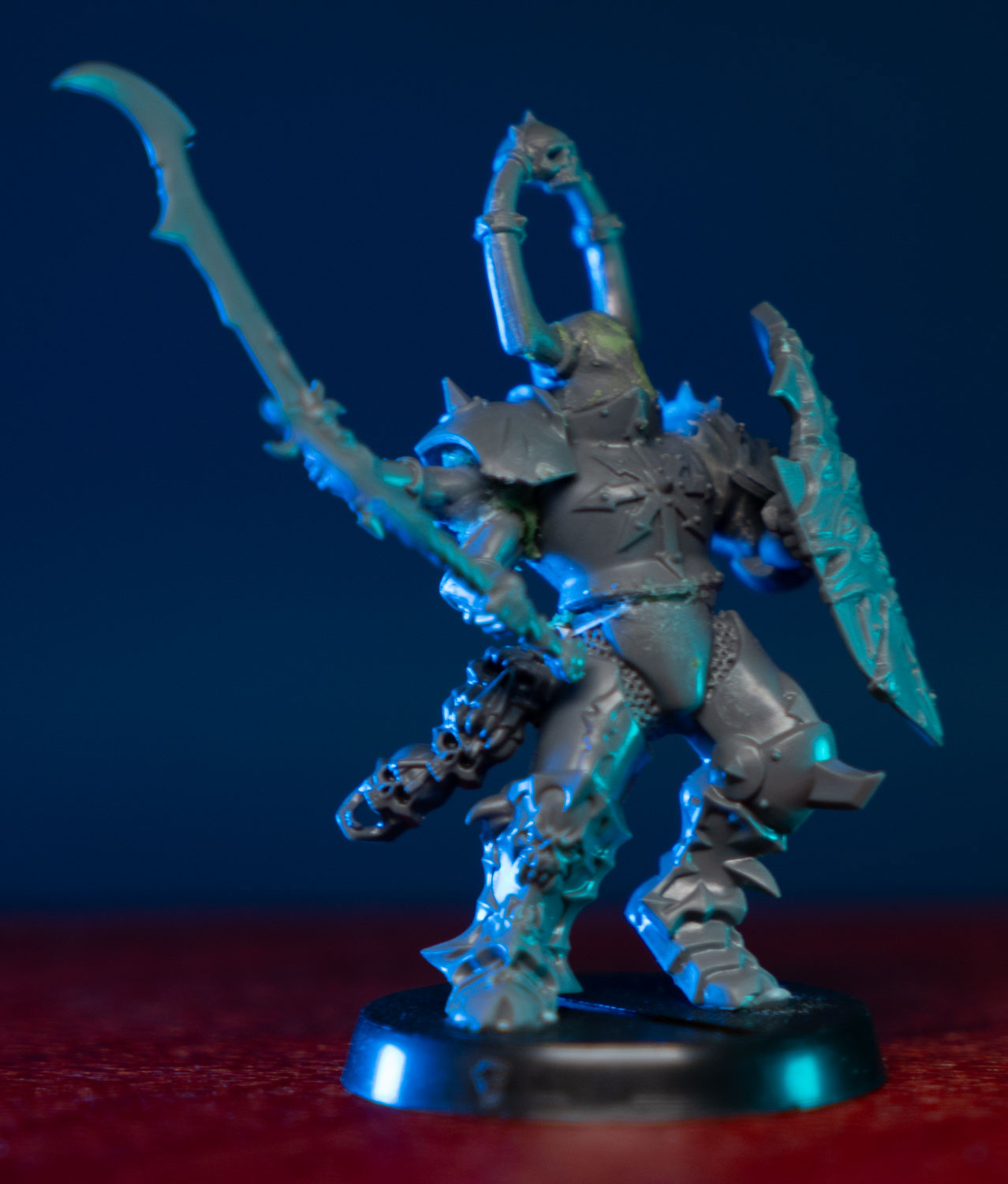 I had a few design rules in mind when converting all of my Tzeentch units. They need to have smooth rounded armor (to show off the color shift paint), their helmets needed to have the eyeholes filled in for a spooky blinded look, and they need multiple arms. Preferably an odd number. Since they’re all blind, I gave the unit champion a shield covered in eyes. I imagine he’s the only one that can see. The rest see only the shifting currents of the winds of magic, and faint ghostly outlines of the souls of their enemies on the battlefield.