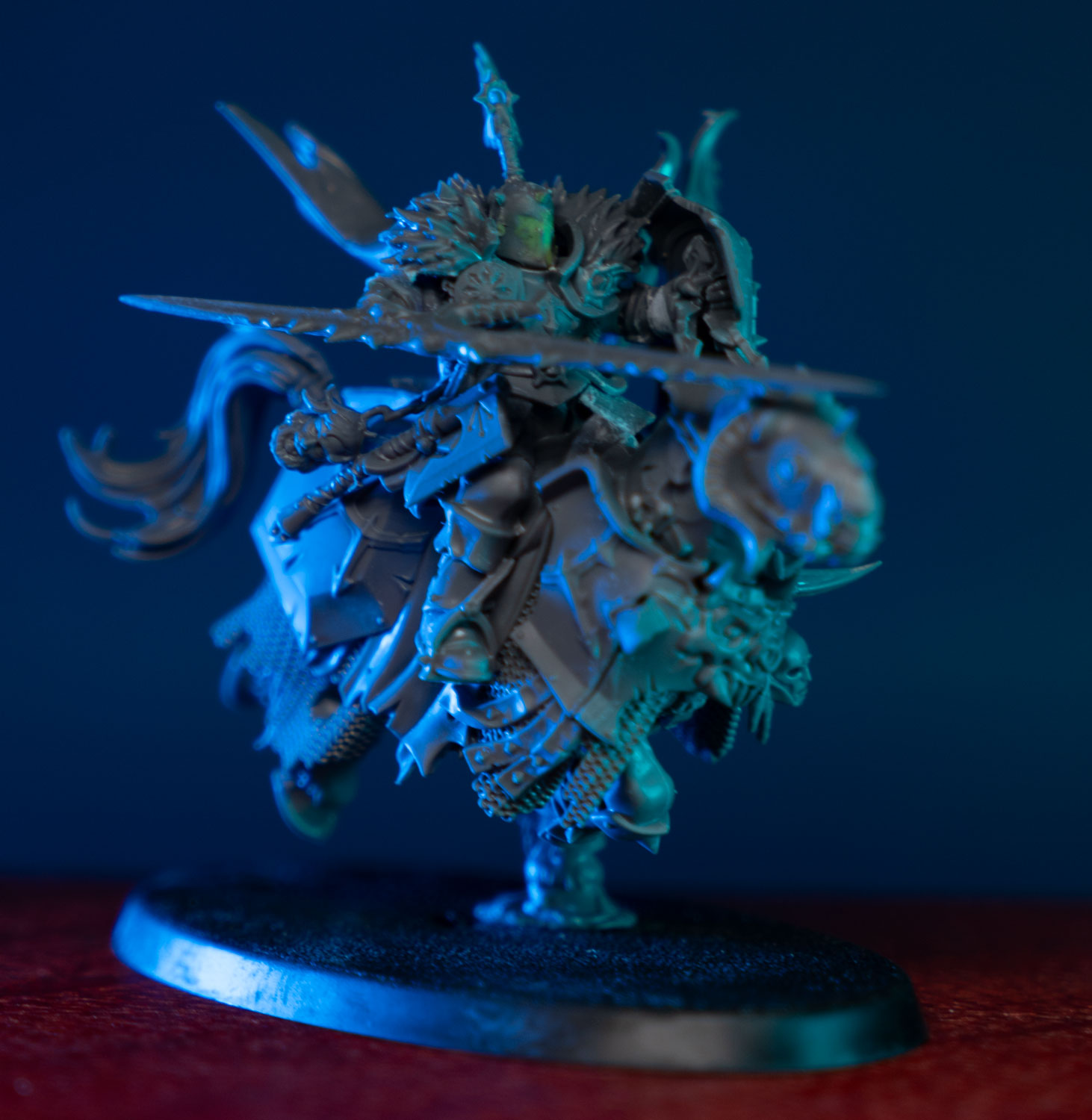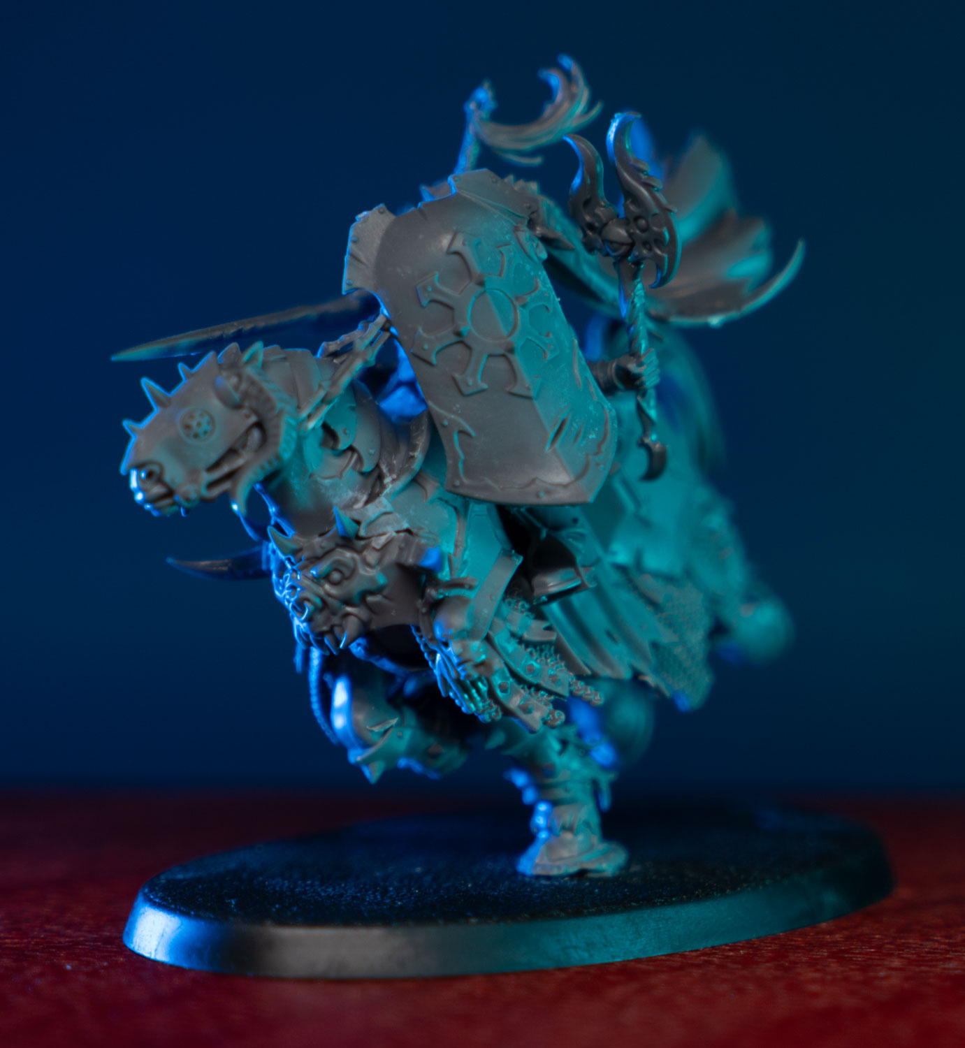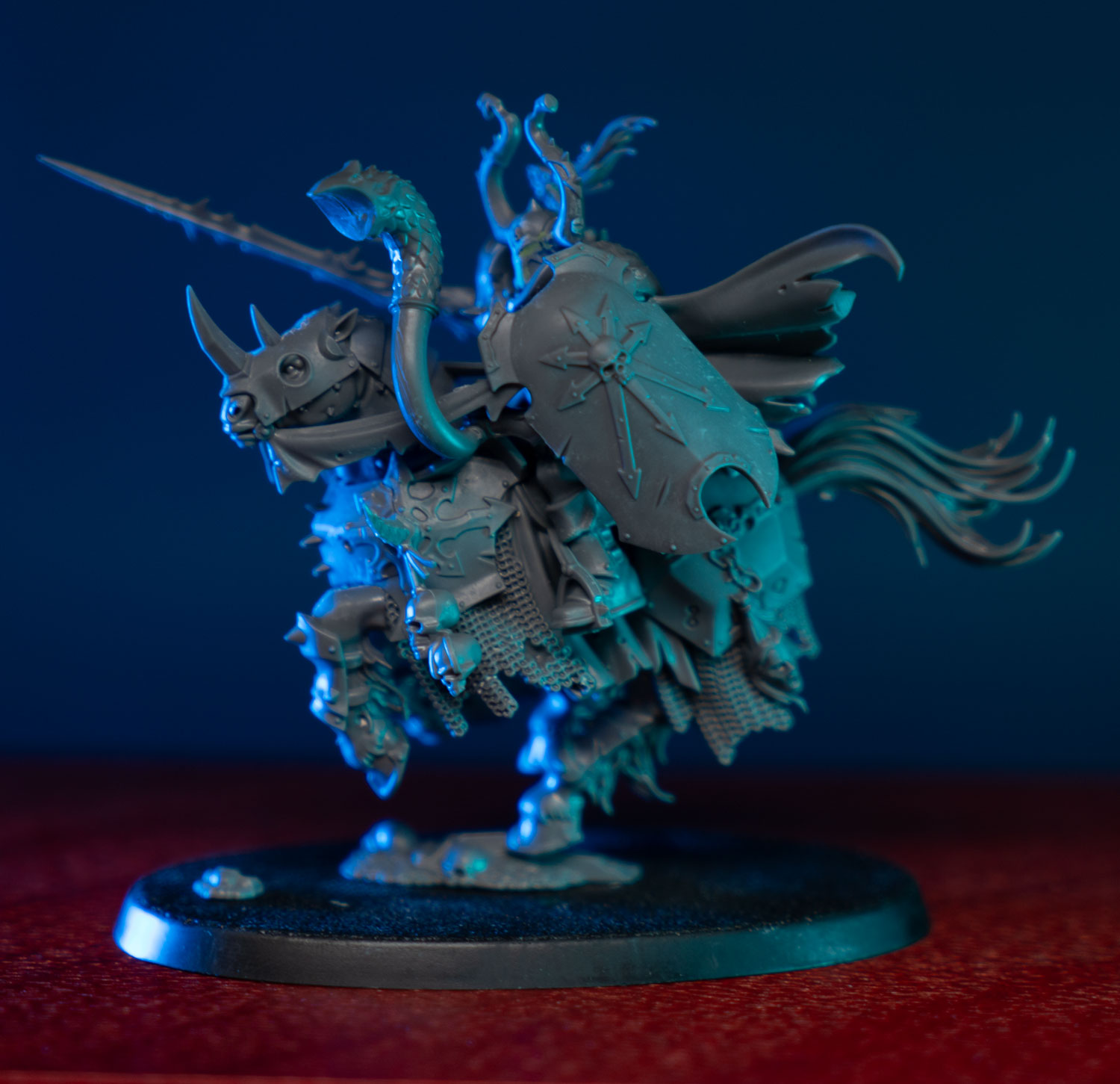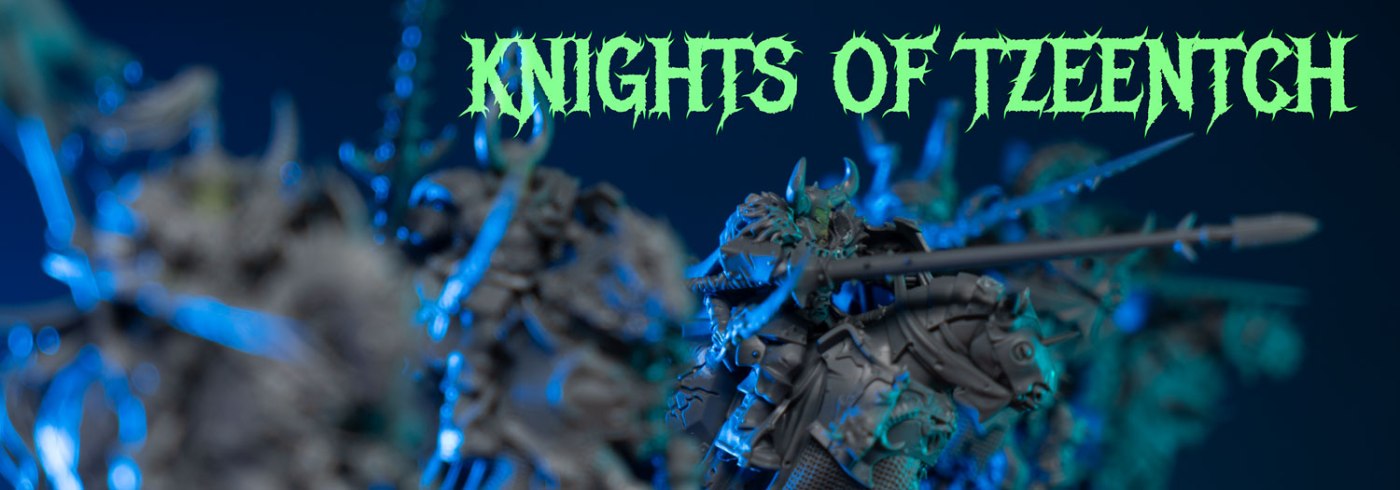 For my unit of Tzeentch-Marked Knights, I followed the same rules as my Warriors of Tzeentch; no eyes, three arms, mutations. I used Tzaangor bits for a few of the weapons, the horn, and the banner. But I used hellstrider arms for the mutated lances which grow directly out of their arms. Super Tzeentchy! This conversion was harder because the new knights kit is very mono-pose. It was hard to differentiate them from my regular ‘Undivided’ knights. I probably won’t use this kit again for that reason. I plan to put my future Knights of Slaanesh on seekers, so stay tuned for that! Lastly, like my Tzeentch Warriors, imagine these guys painted up in the same scheme as my Forsaken.