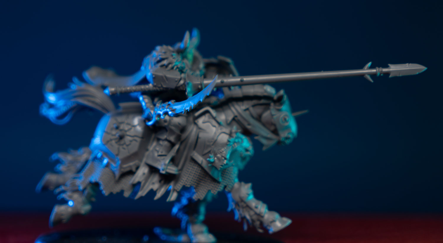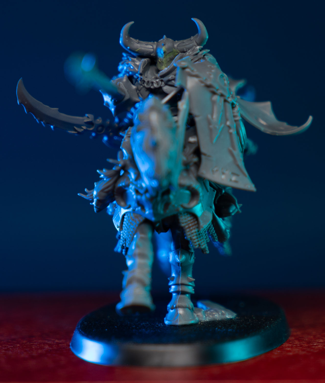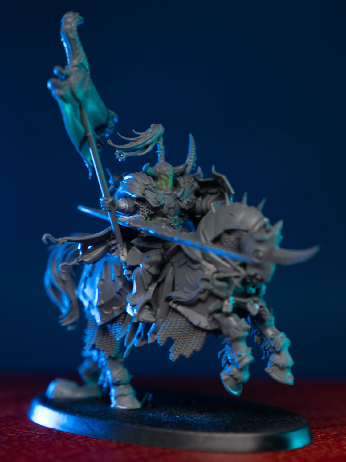 For my unit of Tzeentch-Marked Knights, I followed the same rules as my Warriors of Tzeentch; no eyes, three arms, mutations. I used Tzaangor bits for a few of the weapons, the horn, and the banner. But I used hellstrider arms for the mutated lances which grow directly out of their arms. Super Tzeentchy! This conversion was harder because the new knights kit is very mono-pose. It was hard to differentiate them from my regular ‘Undivided’ knights. I probably won’t use this kit again for that reason. I plan to put my future Knights of Slaanesh on seekers, so stay tuned for that! Lastly, like my Tzeentch Warriors, imagine these guys painted up in the same scheme as my Forsaken.
