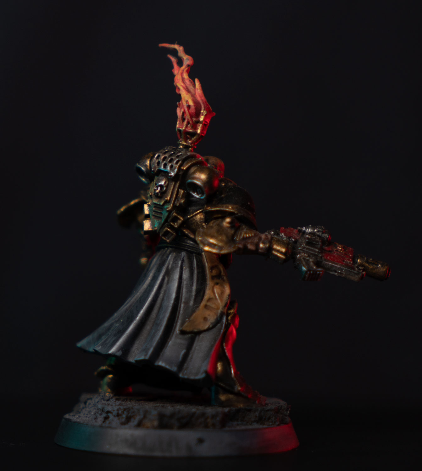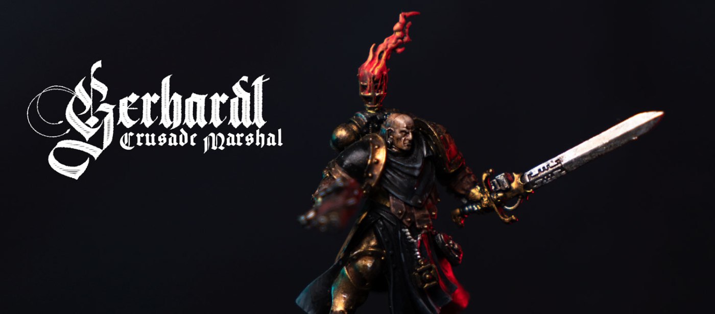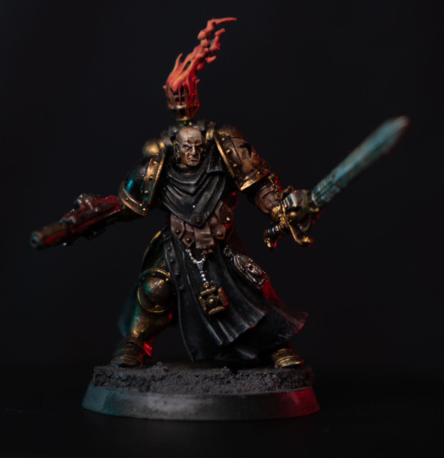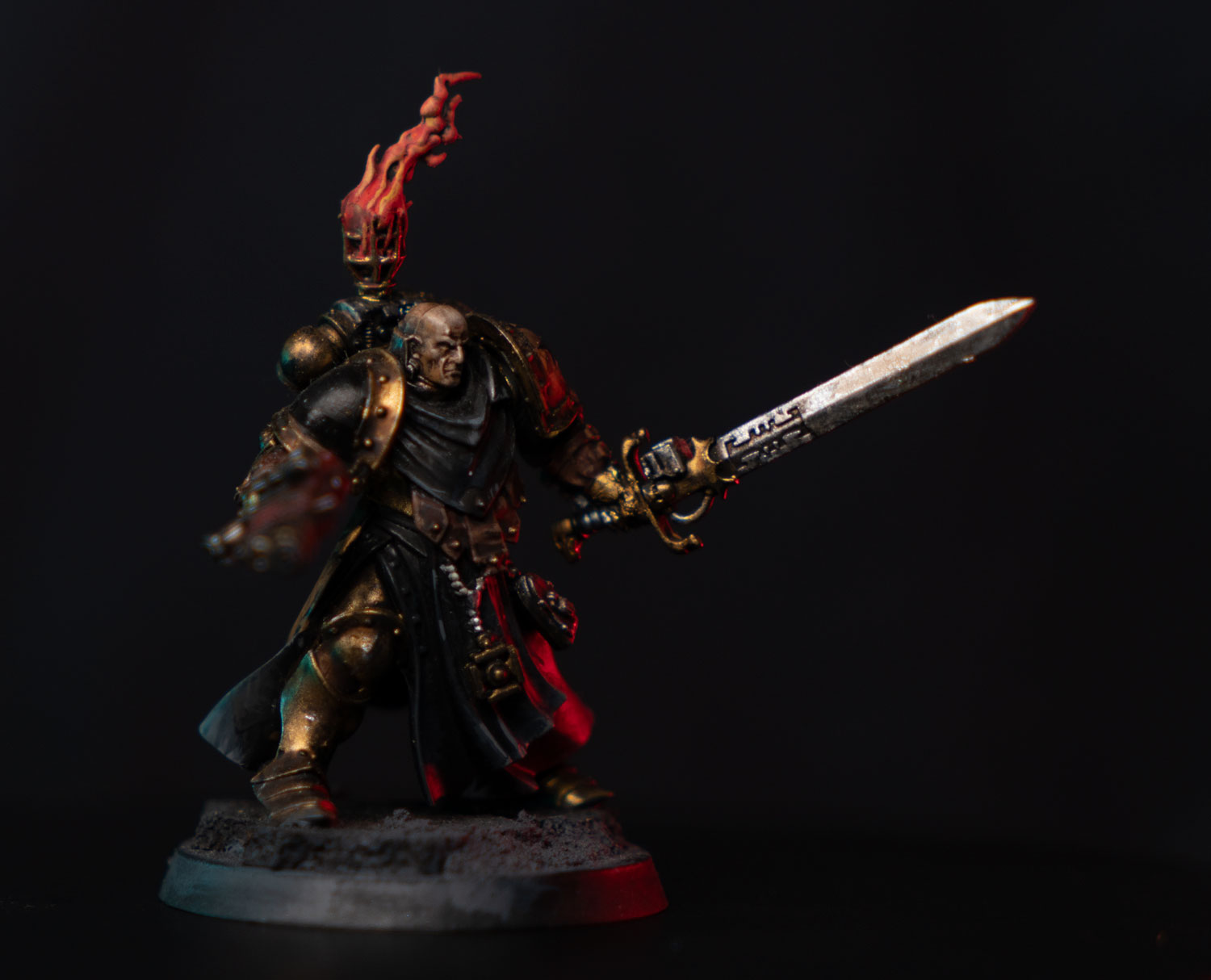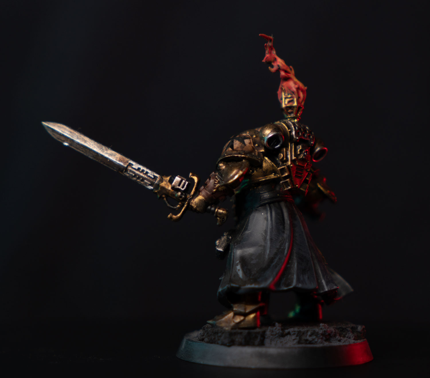 This is Gerhardt, the Marshal of the Calixis Crusade. I made him before Black Templars got their range refresh. He was meant to be a counts-as High Marshal Helbrecht because I wanted an all truescale army. And the old Helbrecht is…well he’s not a tall man. The story for this guy can be found in my Crusade Lore posts. But to sum it up, he wears his predecessor’s armor. But it’s covered in black robes and the heraldry is blacked out while the crusade is in mourning. And by mourning I mean furious retribution.