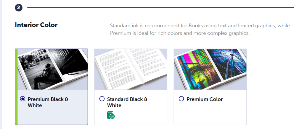Then you just give your product a name and category, and upload that PDF from Broheim. Once it uploads and processes, it’ll automatically figure out the page count and book dimensions. Now you need to choose the interior color options. I went with premium black and white.