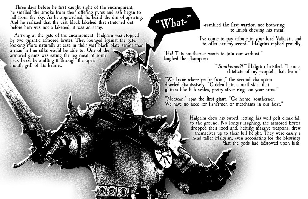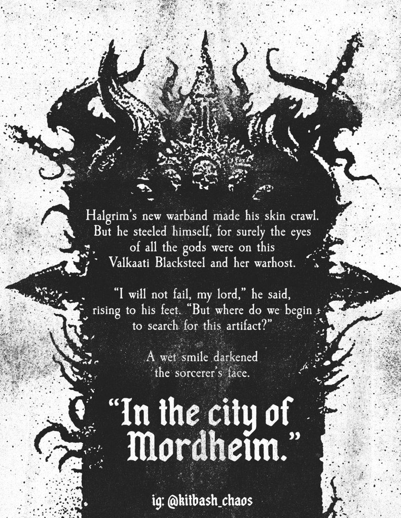 I created a little zine to hand out at the New England Mordheim Open to my opponents. It explains the back story of my warband and why they’re in Mordheim. If you want to print it yourself, here’s a link to file! Print it double sided, then fold it twice so that the cover is on the outside both times, then trim the top edge as thin as you can to open it up. Enjoy!