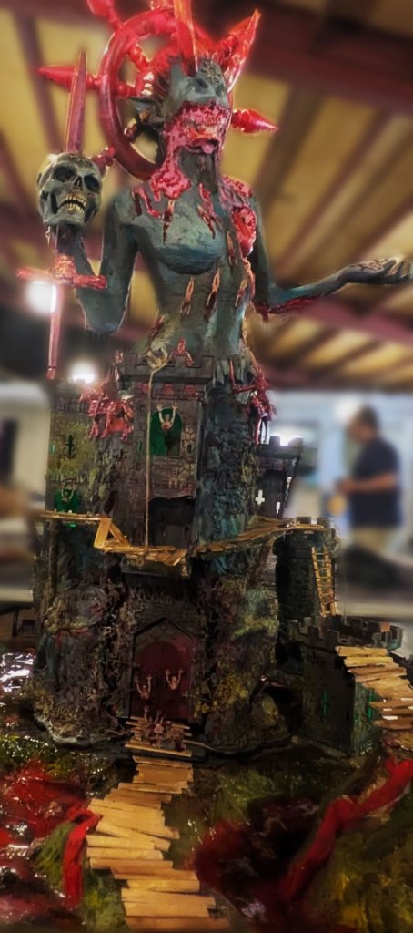 In the light, they could see now that the sticky wetness they walked through was actually blood. Here in the courtyard there was so much blood that in some places it came up to their knees. Bodies, both rotten and fresh, floated in the blood. Several crooked towers lined the courtyard, but their eyes were drawn to the central tower. An enormous statue of a horned woman grew from the tower like a tumor. The stone of her chest was damaged and ripped open. Halgrim thought he could see glistening wet meat in the “wound.” But it was hard to be sure because his eye was immediately drawn upwards to her face. She was looking at him. Through him. Her flaming gaze was fixed on the archway they had entered through but Halgrim had the sense that she was staring through his armor, through his flesh, and into his heart. Judging his worthiness. He was utterly transfixed.