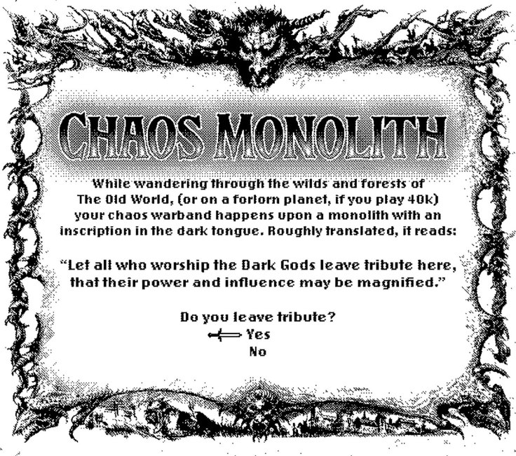So I’ve been thinking lately about what should happen if and when my friends report back that they’ve filled all the stones up with tributes. If you’ve read my narrative battle report, you know that my main character dies during the story (Spoiler alert. But still read it because I think it had a pretty climactic and satisfying ending.) So I was thinking it would be cool to model a daemon prince based on my Halgrim Skullhammer character and only reveal it to the world when the gods are satisfied with the tributes. As if they resurrected him from the dead. I’d even like to write a bossfight scenario for Mordheim around him.